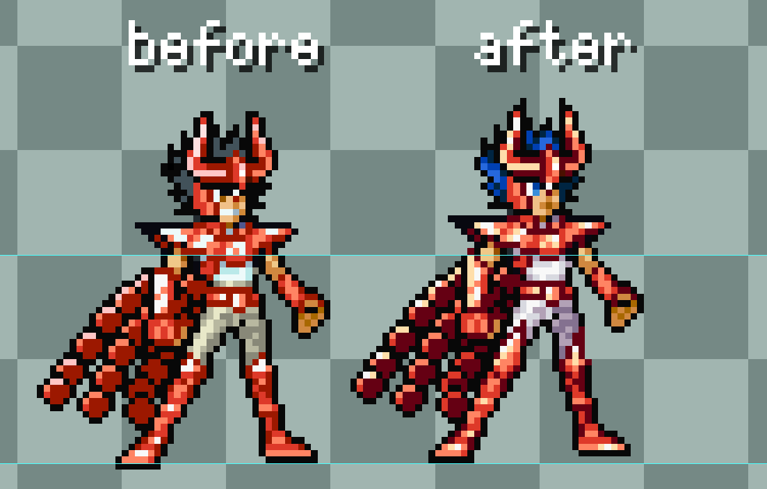 This one took longer than the others because I had to practically redo a lot of the sprites and apply the colors and shading, making him look like Ikki in his armor. I got the sprite sheet from the internet, and it was based on Seiya, so in many of the frames he looked like he was wearing Pegasus armor, and I had to edit it frame by frame.
